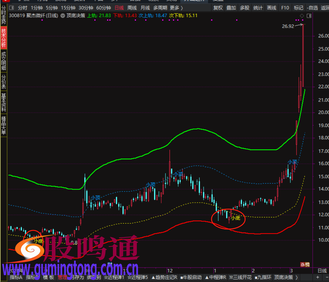1、最上方的红粗线代表股价波动上轨,最下方的绿粗线代表股价波动下轨。