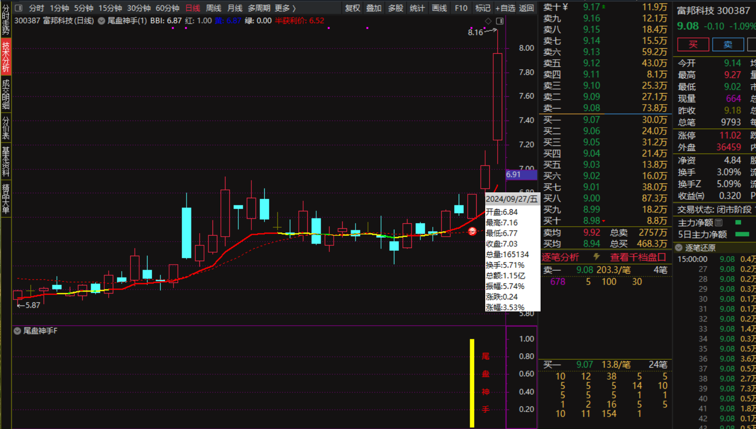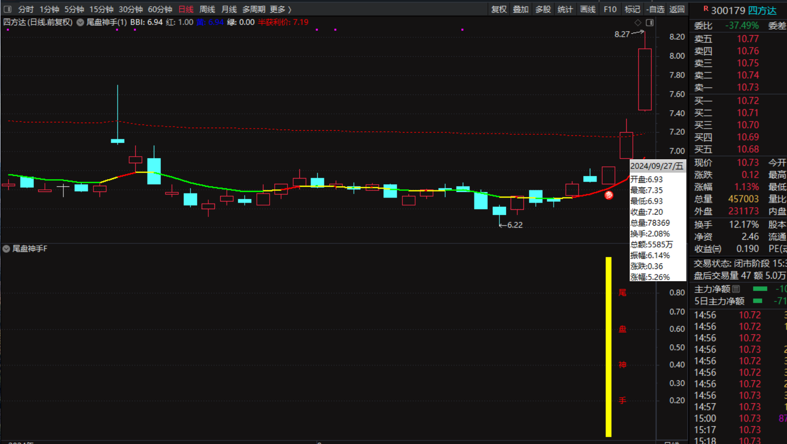 通达信【尾盘神手】指标,今买明卖,尾盘猎杀,主图、副图、选股,尾盘14点55分出击,无未来函数,手机电脑通达信通用
