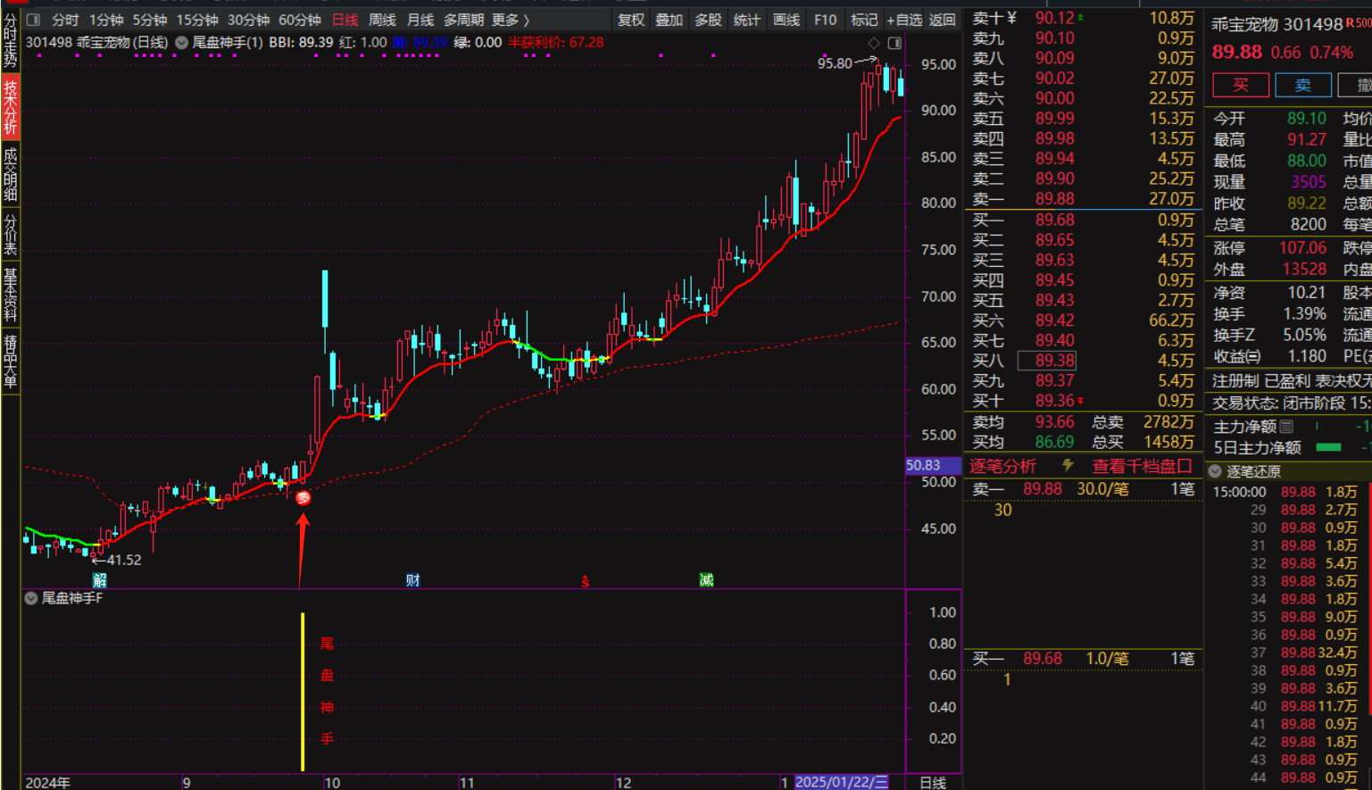 尾盘神手指标包含 1主图 1副图 1选股,信号不漂移,尾盘出击,电脑端可设置预警,手机端尾盘14:55分手动选股,手机电脑通达信通用,信号仅供参考。关于胜率:当日信号尾盘介入,次日最高价出局胜率96%。 1.具体特点与操作建议如下: 该策略为超短线选股,操作方法与时间节点:尾盘14:55分选股,14:57---14:58分 捕捉低价确信号后介入,次二日或第三日拉高出局,实现快进快出的目标风格。 2.风险与收益: 尾盘交易伴随较高风险,如市场情绪波动、主力资金动向等不确定因素可能影响次日股价走势。 需谨慎分析,结合自己的策略和风险偏好做出决策,以迅速赚取差价为目标。 3.大盘环境与操作建议: 当大盘环境不佳时,建议保持观望,避免盲目操作。 稳健是长期盈利的关键,应综合考虑市场状况和个人风险承受能力。 4.指标与策略: 市场上还存在其他类似的尾盘指标和策略,可以结合自身需求选择适合的策略进行组合使用。 需要注意的是,任何指标策略都存在一定的市场风险,应谨慎评估并合理控制风险。
